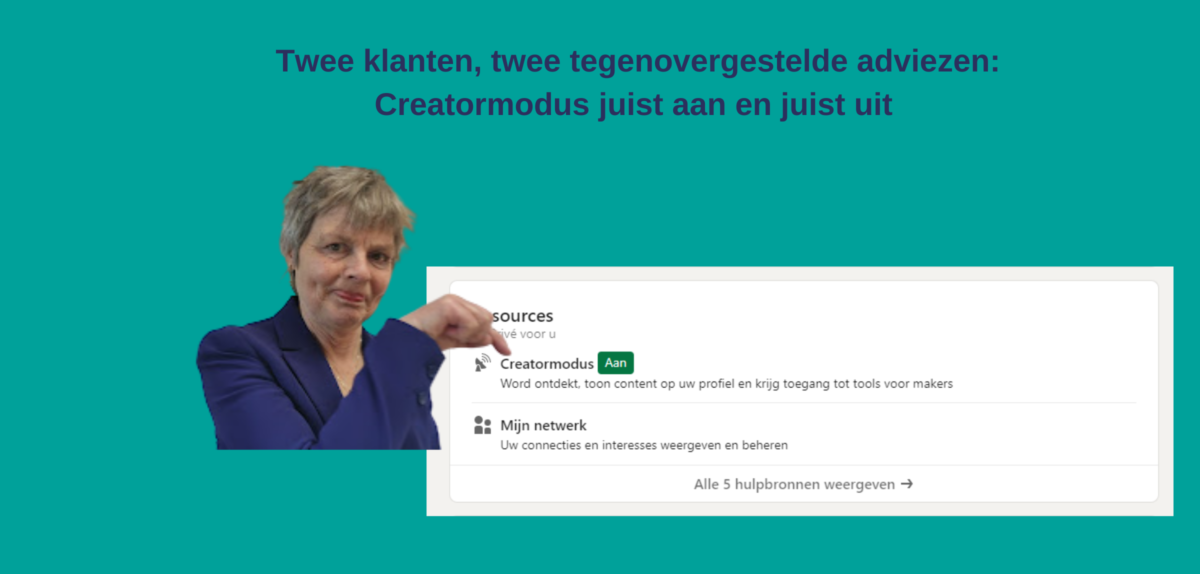 | Vanochtend had ik twee sessies met klanten. De een raadde ik aan om vooral de Creatormodus aan te zetten. En de ander om die juist uit te zetten. Creatormodus aan Marieke heeft een specifiek product voor het voortgezet onderwijs. Op LinkedIn heeft zij al een goed netwerk, een flink deel van haar connecties werkt in het Voortgezet Onderwijs. Het lukt haar niet om een paar keer per week een bijdrage plaatsen op LinkedIn een keer per maanden wat uitgebreider artikel schrijven en plaatsen gaat haar makkelijk af. Het grootste voordeel van de Creatormodus Het grootste voordeel van de Creatormodus is dat je een LinkedIn-nieuwsbrief kan maken. Al je connecties krijgen de uitnodiging zich te abonneren. En eenmaal abonnee krijgen zij nieuwe artikelen ook vanzelf in hun mailbox. Ik raad Marieke dan ook aan om de Creatormodus op haar profiel aan te zetten en met die nieuwsbrief te starten. Creatormodus juist niet aan Carolien begeleidt hoog opgeleiden boven de 50 die nog een interessante stap in hun loopbaan willen maken. Carolien start nog maar net op LinkedIn. Voor haar is het aanleggen van een goed netwerk haar eerste prioriteit. En regelmatig een bijdrage plaatsen op LinkedIn, dat gaat haar goed af. Het grootste nadeel van de Creatormodus ![]() Het grootste nadeel van de Creatormodus is dat mensen op je profiel de ‘volgknop’ zien. Dat betekent dat mensen extra moeite moeten doen om met je te connecten. En wat handigheid met LinkedIn moeten hebben. Carolien, die juist de Creatormodus aan had staan, raad ik aan om die uit te zetten. Zo maakt ze het zo laagdrempelig mogelijk om mensen met haar te laten connecten. Wat is die Creatormodus? LinkedIn kent de functie Creatormodus. Het is een instelling op je persoonlijke profiel. Het uitgangspunt van de ‘Creatormodus’ is dat je wat jij schrijft en plaatst meer aandacht kan geven. Een paar dingen op je profiel zien er anders uit, zoals dat mensen niet meer als eerste actie ‘connecten’ zien, maar juist ‘volgen’. Ook krijg je direct toegang tot twee extra functies, te weten LinkedIn Live en de mogelijkheid nieuwsbrieven te verspreiden via LinkedIn. De Creatormodus zet je eenvoudig aan of uit op je profiel, en je kan het altijd weer veranderen. Voor sommige mensen is het handig, voor anderen juist niet. Creatormodus nuttig voor jou? Vraag jij je af in hoeverre het aan of uitzetten van die Creatormodus jou helpt bij je doelen op LinkedIn? Ik adviseer je er graag over. |